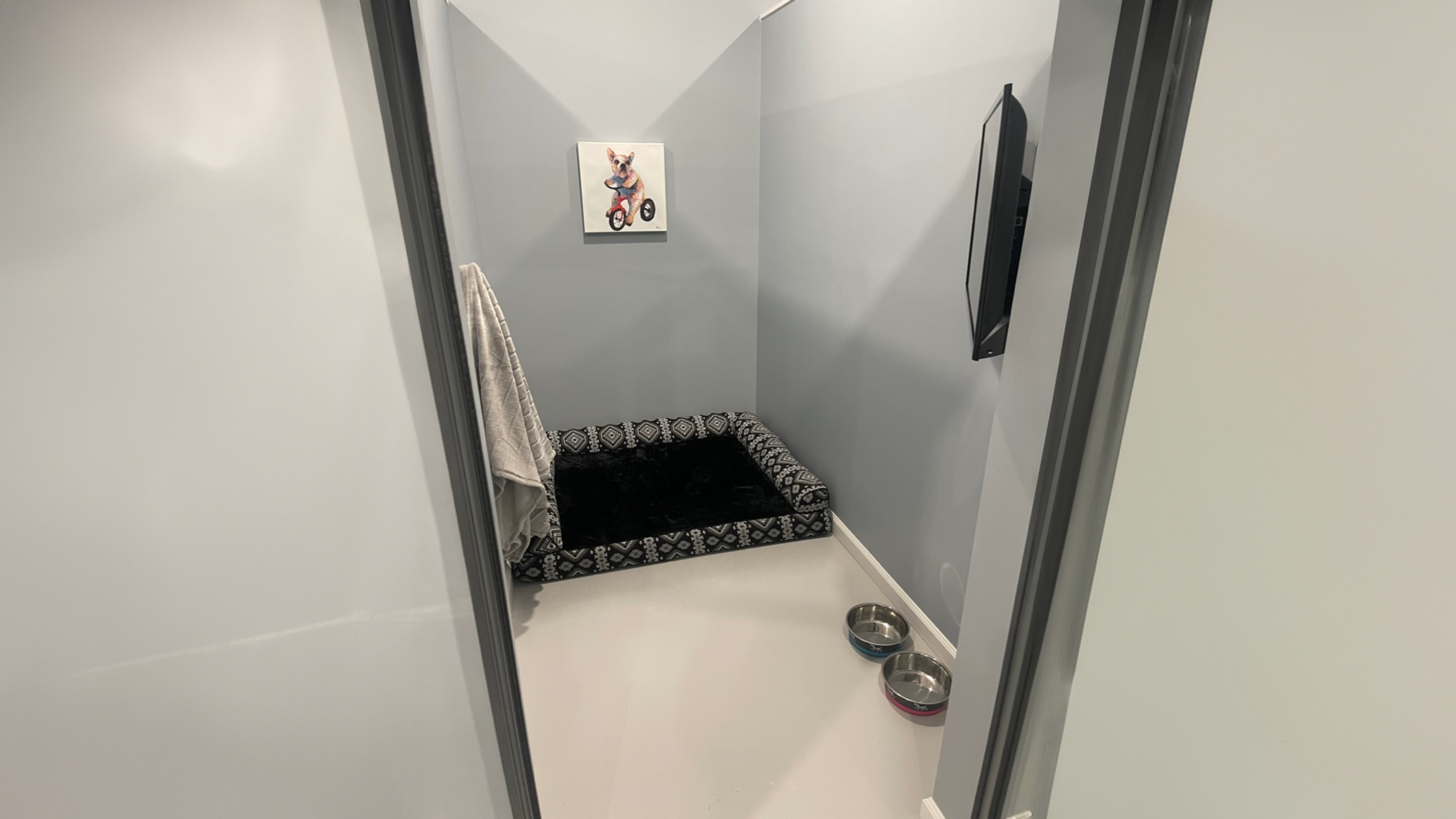 Each room has a glass privacy door, to give a quiet peaceful environment for the duration of their stay. Each guest will receive a plush blanket, a bed and a TV playing the most popular Animal Planet shows to help provide a comfortable home-like environment.