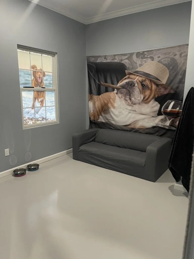 A fully furnished 100 square foot VIP room. This suite has a large comfy love seat couch and 55 inch TV! All day daycare play is included in this package as well as our late check out option. This suite is perfect for our over the top guest or a family that wants to spend their time together at the Barkgata. These rooms are highly exclusive and have very limited availability, we encourage you to book as early as possible!